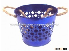 Blue color galvanized metal planter pot with jute handle for garden & home